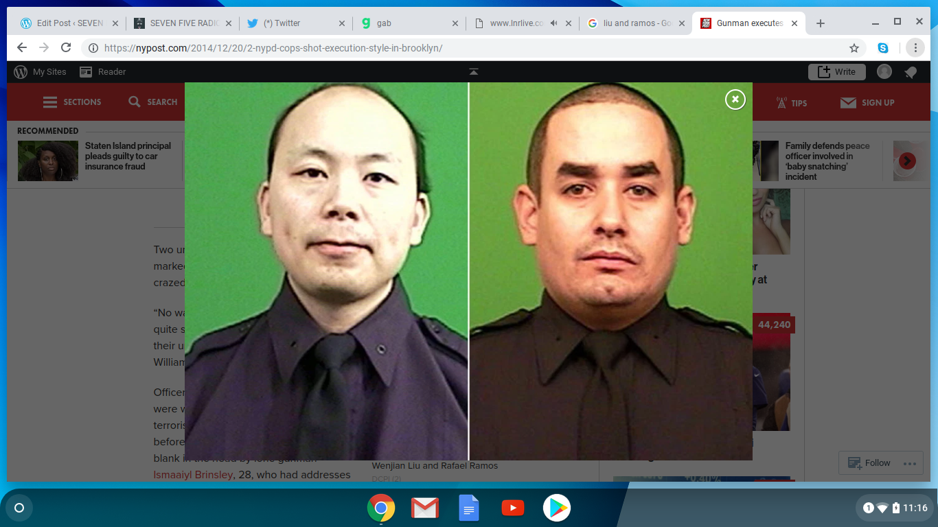 On December 20, 2014 A piece of shit traveled from Maryland to New York City to kill cops. The piece of shit named Ismaayil Brinsley walked up to an RPM (cruiser) and shot the two people pictures above who were working overtime on a Saturday afternoon. Their names are Detective Wenjian Liu and Detective Rafael Ramos. Fortunately Brinsley took his own life.
