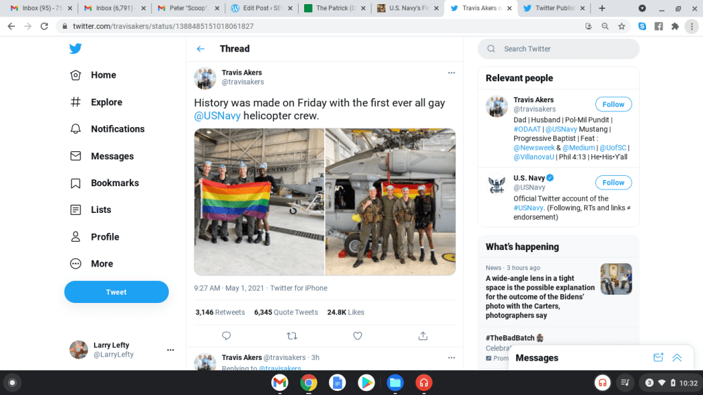 The Chinese, Russians, Iranian’s, and the Taliban are running for the hills because of the first all gay air crew! We went from David Farragut to Chester Nimitz to Chris Kyle to this!? Sailor please! I have heard nothing about God, country, duty, family, honor, courage, and commitment. As if the DoD doesn’t spend enough money, the Pentagon will also pay for sex change surgery at $200,000 a pop! I imagine the scuttlebutt in the “Goat Locker” the Command Master Chief telling all the other Chiefs that they should all get behind the Biden Administration and support the idea pf this surgery! GTFOH!