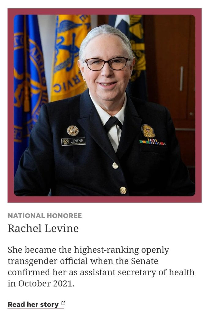 In an announcement fit for the Babylon Bee, USA Today has recognized Richard Levine as Woman of the Year. Admiral Levine was born with male parts, never breast fed an infant, never gave birth and never experienced a menstrual cycle! In terms of accomplishments Levine has done nothing. He was appointed Assistant Secretary of HHS and then he was appointed a 4 star admiral with the US Public Health Commissioned Corps. He was only appointed because he is a tranny. His only accomplishment is to convince kids to be transgender and pull his mother out of a nursing home while other people were left to rot! Kids can’t decide what they want for dinner, what they want to be for Halloween or what they want to be when they grow up! But; it figures: Fake News giving recognition to a fake female!