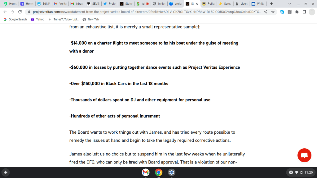 Years ago, James O’Keefe made a name for himself when he exposed ACORN when he said he was trafficking girls in prostitution. Over the years O’Keefe and Project Veritas helped expose CNN, the CDC, and more recently, Pfizer. Monday we found out that the Board of Directors had fired O’Keefe. The actions by the Project Veritas Board of Directors raises a question; Why would Project Veritas have a Board of Directors? It’s not like Veritas was big as CNN, Fox News or Brietbart. Next; what did O’Keefe do to get fired from PV? There have been allegations that O’Keefe was a miserable person to work for and he had a huge ego. There are also rumors that O’Keefe traveled to events wearing a bullet resistant vest and a wig. Project Veritas acccuses O’Keefe of squandering thousands of dollars.