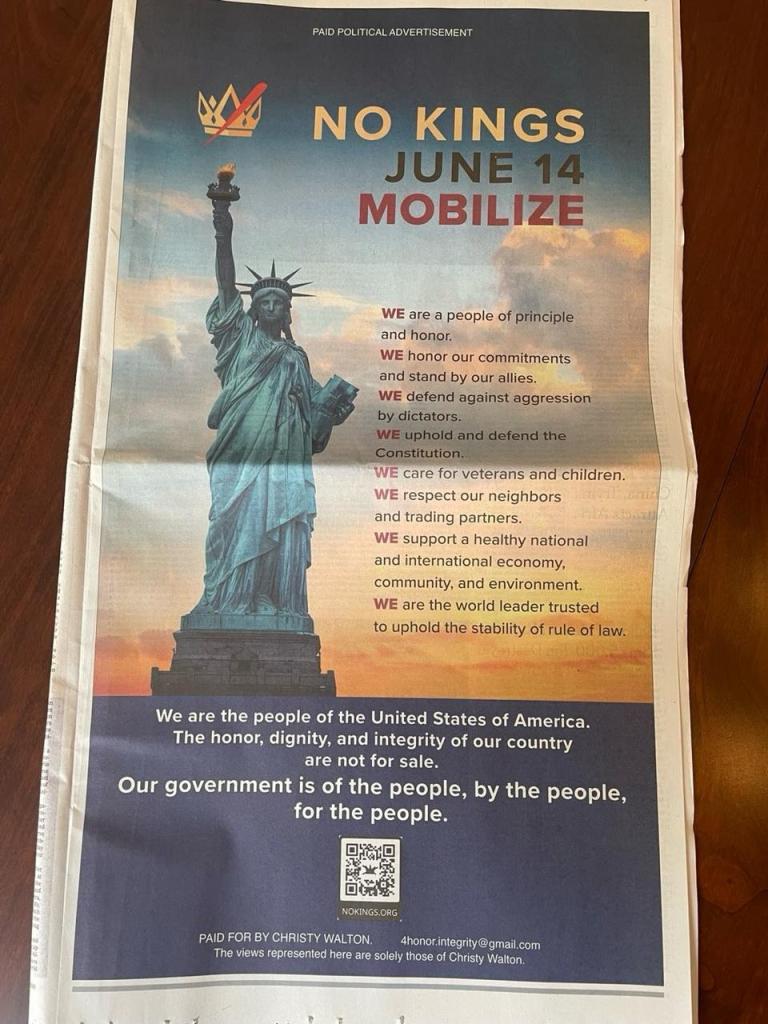 This Saturday there will be rallies around the nation to counterattack the June 14th celebration of Flag Day and the 250th anniversary of the US Army! The movement is called No Kings. This grassroots movement was started by two liberal white women! This past Sunday One of the richest people in America, Christy Walton paid for a full-page ad in the New York Times. Walton is part of the Walmart fortune. But, she married into the family!