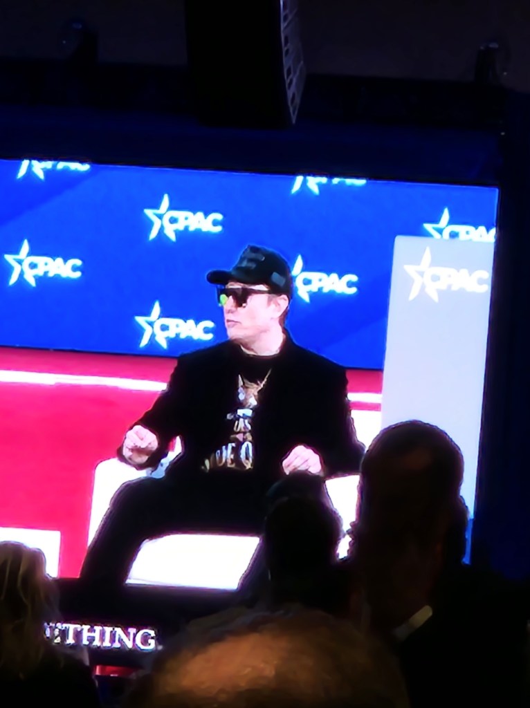 I reached out to “75 Radio” guest and now friend Christopher Martini. He said he’ll meet up after Elon speaks. Elon Musk was not on the list! So I went into the ballroom. British politician Nigel Farage came on. Here was a Brit who loves America more than your average Democrat. Then a dude from Newsmax came out with something about DOGE. Then he introduced Elon Musk who came out and the crowd roared. Argentina President Javier Milei presented Musk with a chainsaw! The crowd roared! Musk was very personable, funny and to the point. He had a couple of good points.