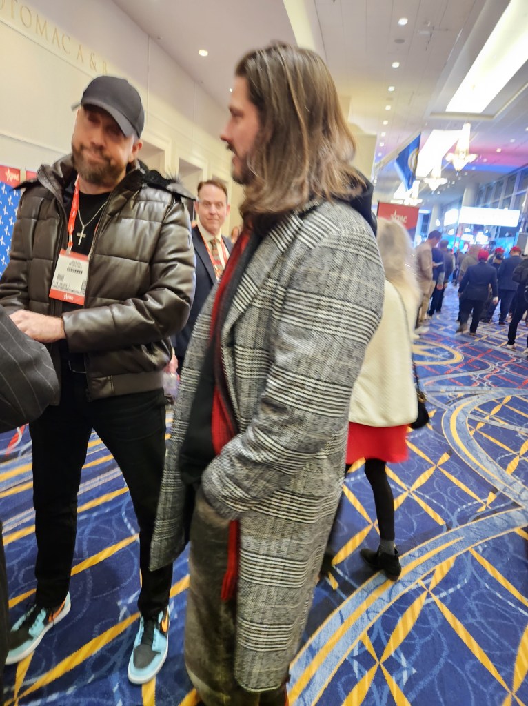 As I’m standing to get my creds, I see world famous fashion designer Andre Soriano! He was there as a media member! And unlike me, he has his creds! The man knows everyone. He is everywhere. He does everything! How does the man sleep!? As I’m walking down Radio Row, there were more media there than last year. Newsmax, The Epoch Times, Mike Lindell’s outfit and many others were there. As I’m looking around, I see a familiar couple: Mr. and Mrs. Dennis Kucinich! Elizabeth stepped away and so I went to Rep. Kucinich. But just before, I did what I did best: text James Edwards. He sent a pic of himself with Kucinich! Holy Dogshit! I introduced myself again. I told Dennis how we met 13 years ago at Dulles Airport. I asked what he was doing at CPAC. He said: “these are my people.” I was blown away. Here’s a man who I disagree with 99%. I was blown away.
