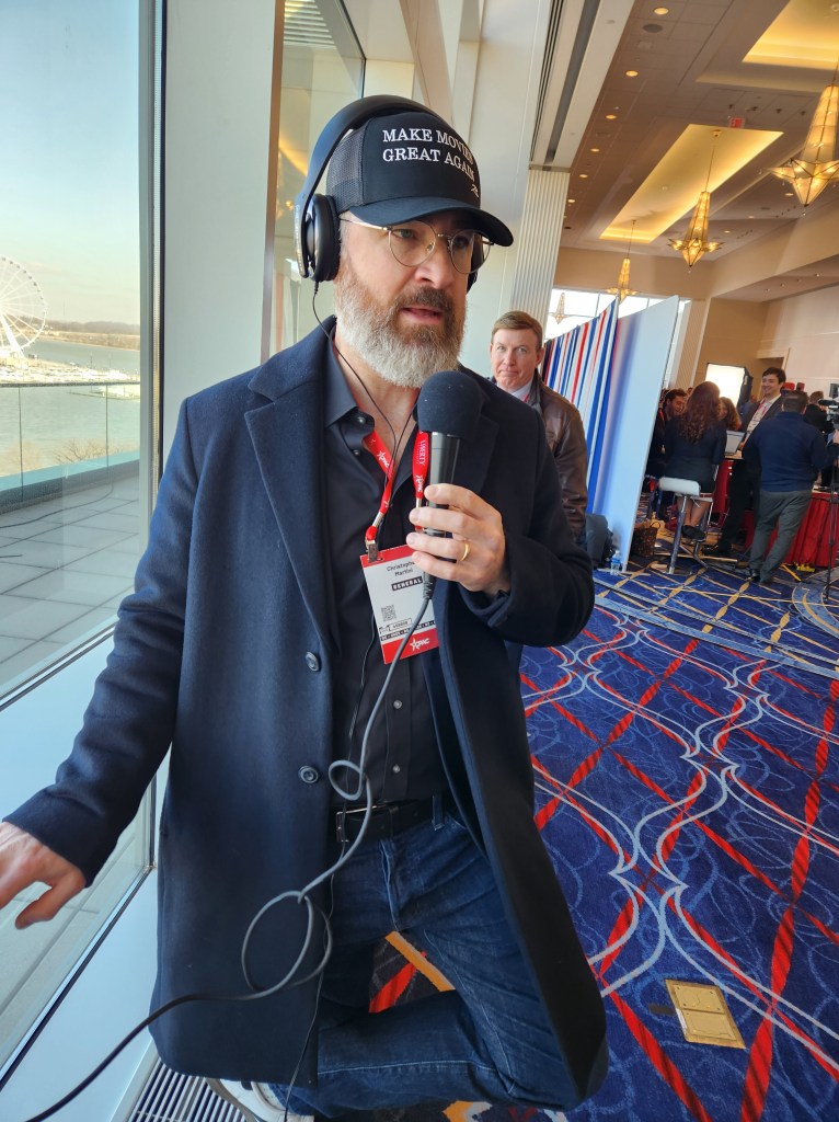The next day I went to CPAC and found an empty table on Radio Row. I fired up the old computer and was talking. This very nice lady told me to move. I felt like such a dirtbag! So; I found some space at a window. I got a hold of film director Christopher Martini who wore a “Make movies great again.” I was both proud and embarrassed of my homeless man studio! Chris killed.